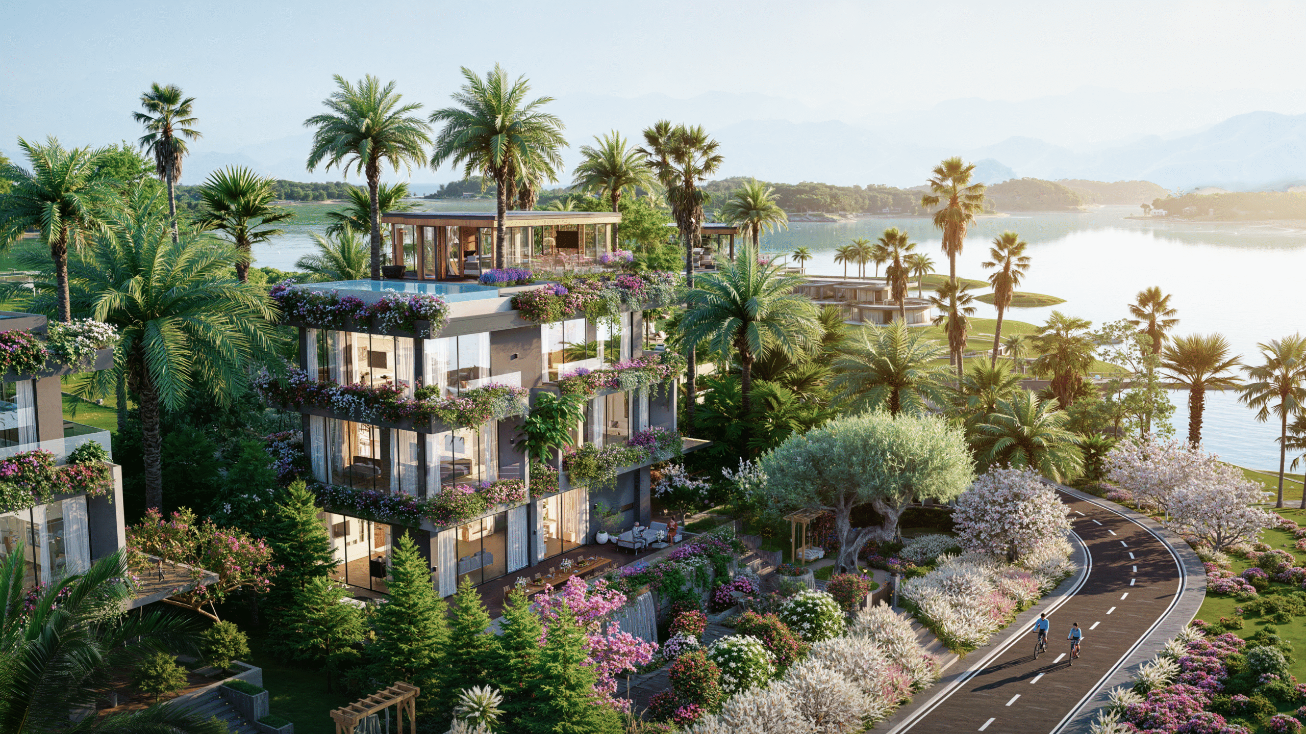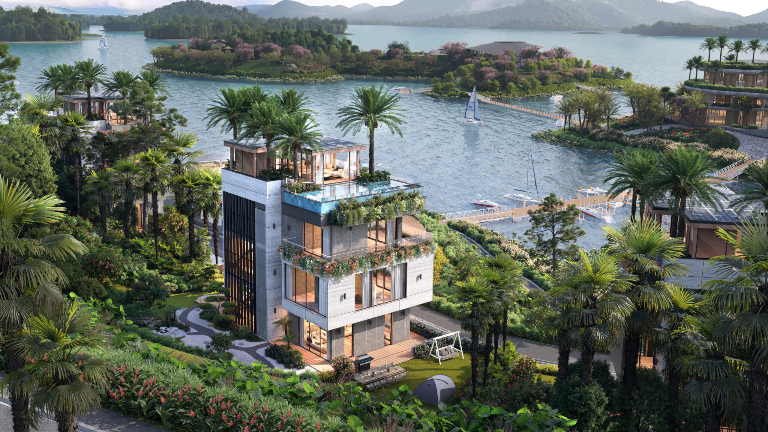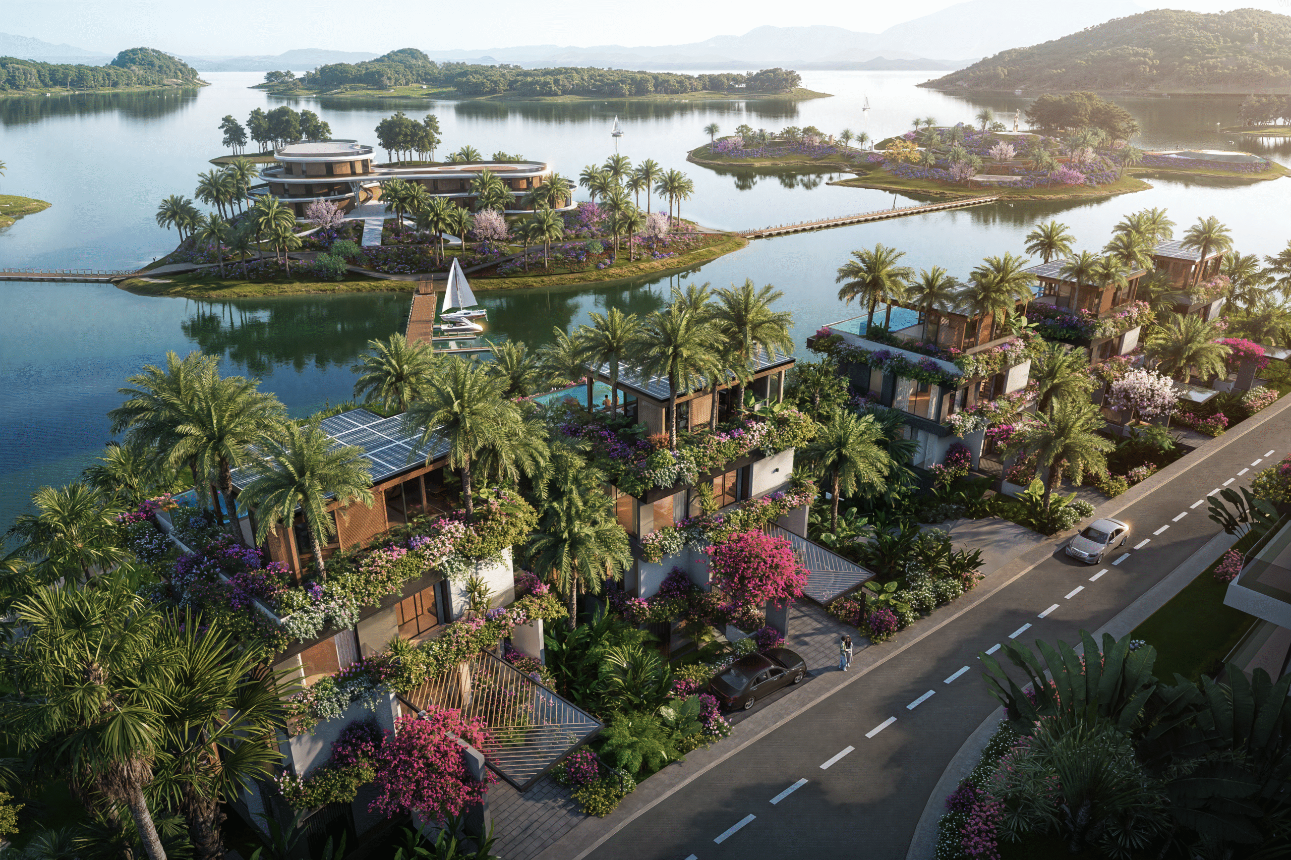 Tận dụng tối đa địa hình triền núi tự nhiên, các tư dinh biệt lập được xếp tầng hài hòa, so le một cách tinh tế theo thế núi, đảm bảo mỗi ban công đều hướng về mặt nước xanh ngắt mà không bị che chắn, sở hữu tầm nhìn bao trọn 100% cảnh quan “hồ trên núi”.