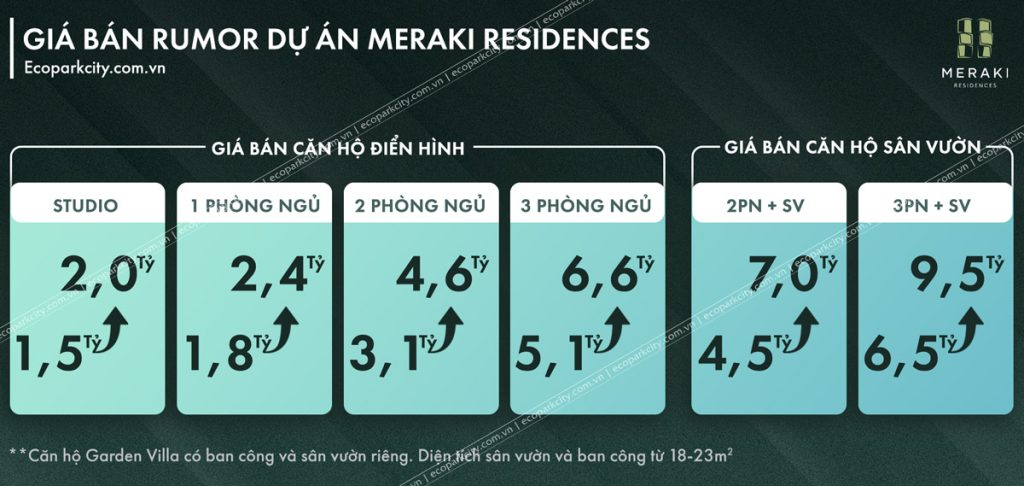 Tổ hợp căn hộ chung cư Meraki Ecopark có mức giá bán Rumor vô cùng hấp dẫn và là cơ hội sở hữu cũng như đầu tư không thể bỏ qua. Mức giá bán căn hộ Meraki dự kiến nằm trong khoảng từ 42-77tr/m2. Các căn hộ điển hình sẽ có mức giá bán nằm trong khoảng 42-60tr và các căn hộ sân vườn, căn hộ góc sẽ có mức giá bán cao hơn với mức giá cao nhất là 77tr/m2.